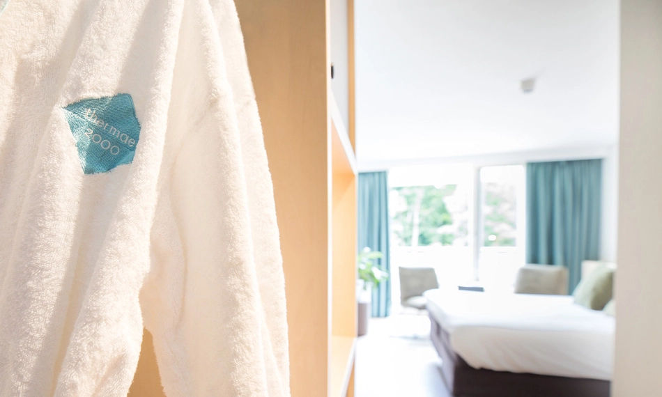 Erlebe eine Wellnessübernachtung an einem einzigartigen Ort auf dem Gipfel des Caubergs! Nach einem herrlichen Tag in Bädern und Saunen gehst Du im Bademantel direkt in Dein Hotelzimmer im angrenzenden Wellnesshotel Thermae 2000.